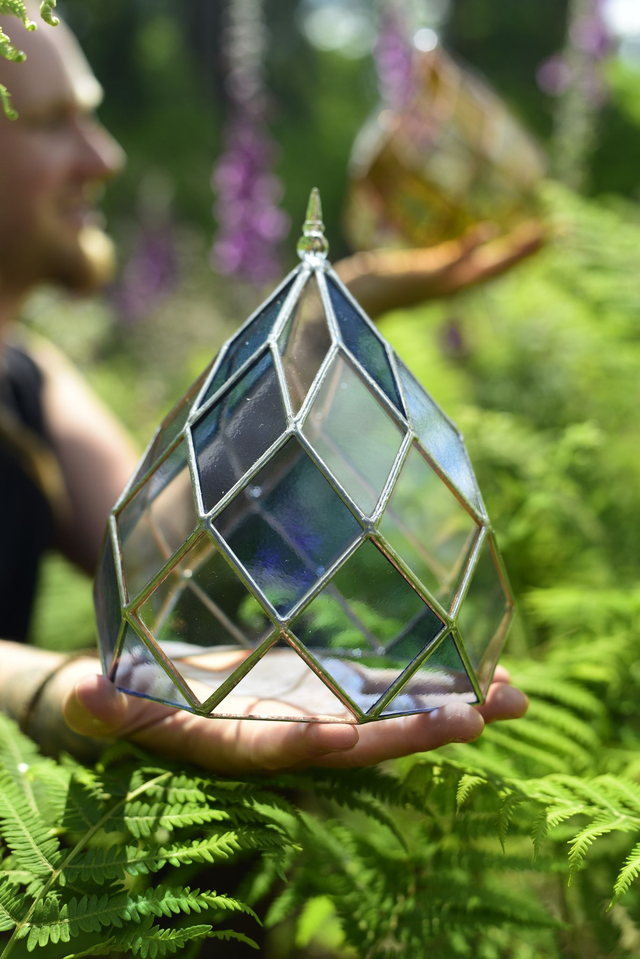 Zome à 8 côtés en verre bleu avec option : socle en merisier.